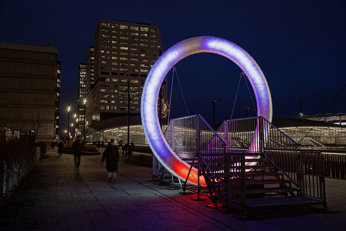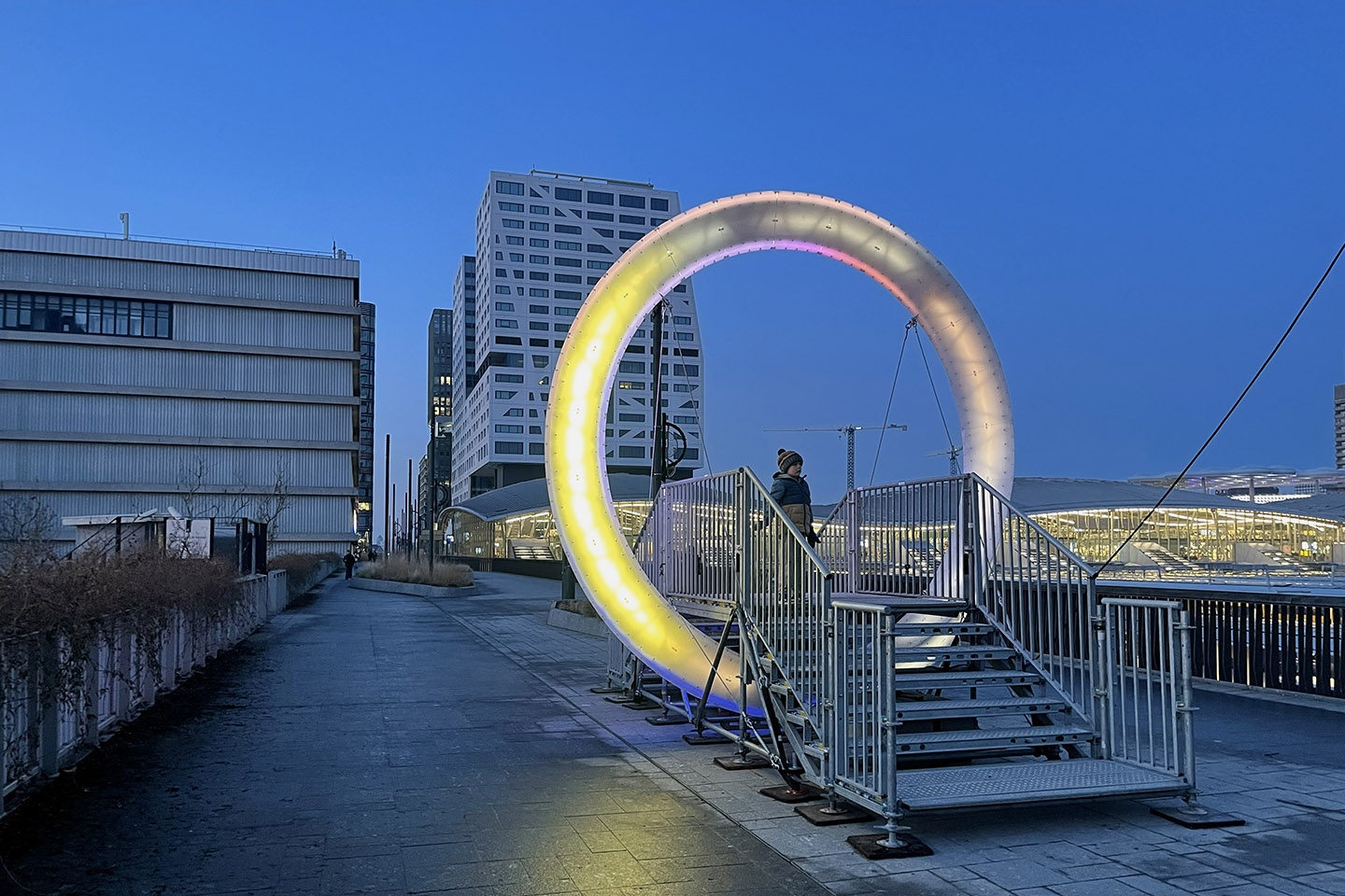The moebiusring’s play of light is influenced by pedestrians in their use of the urban space, and marks a moment of crossing. The circular gate around the pedestrian bridge is a physical symbol of social and urban interaction and an urban manifestation of the ‘rite the passage’.