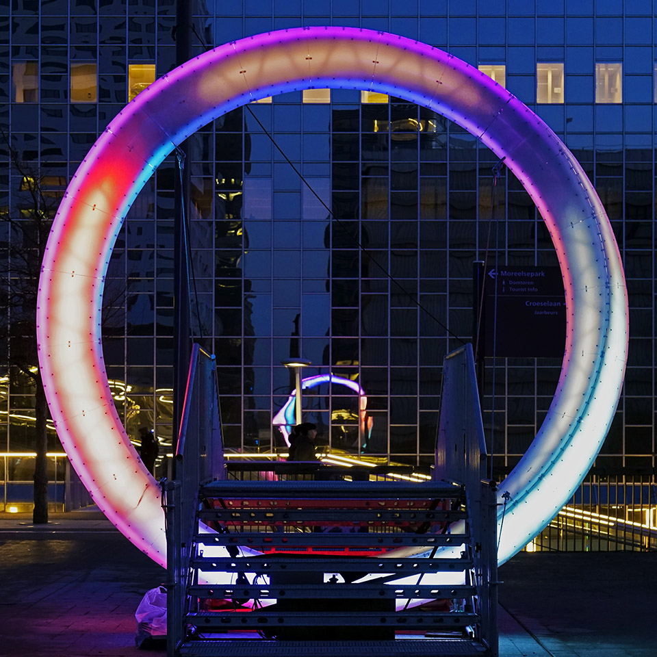 Circle of Life is a ring shaped light sculpture, inspired by the Moebiusring. It is the embodiment of the reciprocal interaction of life, as the City is a representation of social interactions. The three sides of the ring are part of a continuous surface because the structure of the moebius, making a 3 dimensional shape out of 1 continuous surface. A circle in a circle, mimicking life as a continuous movement, reciprocal and circular in nature.