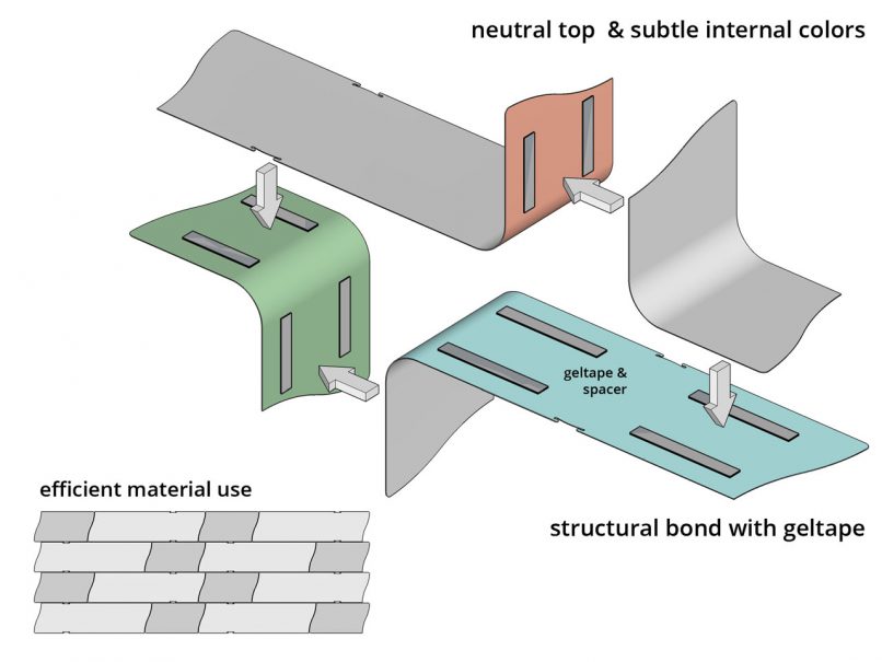 De vlakke platen van metaal die de basis vormen van Aileron kunnen efficiënt met laser gesneden worden met minimum materiaalverlies. Na het buigen en moffelen worden vier elementen samengeveogd met high tech vliegtuiglijmtechnologie: geltape. De structurele verlijming van geltape en de vorm van de metalen platen zorgen voor een sterke en betrouwbare boekenplank voor dagelijkse objecten.