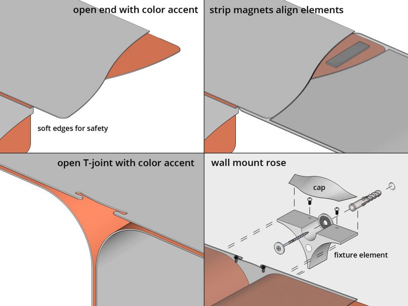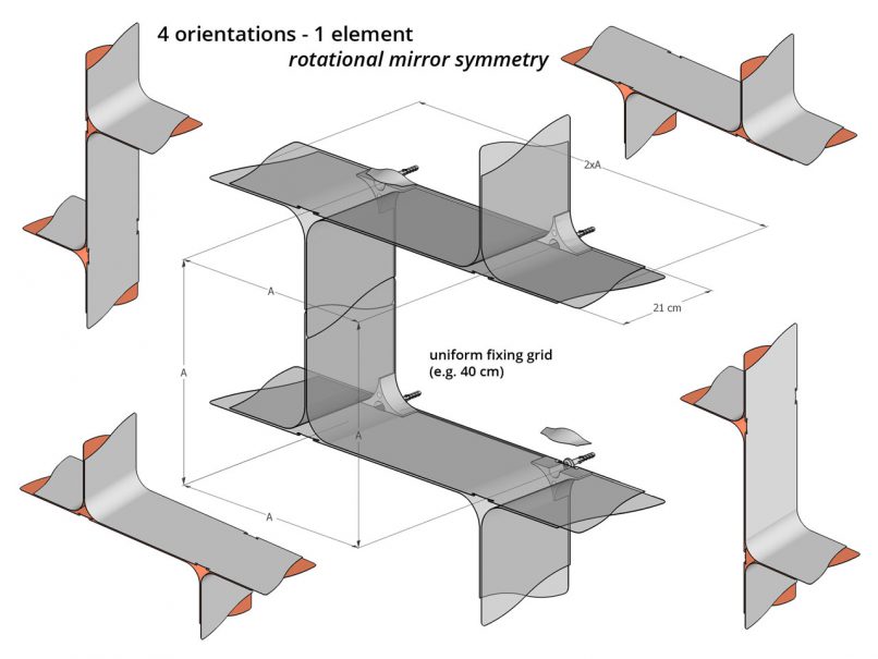 Het basiselement kan in vier posities op de muur geplaatst worden, waardoor een eindeloze verscheidenheid aan combinaties afmetingen ontstaan. De basis is een vierkant raster van elementen – een ‘rozet’ – die kan draaien naar gelang de richting van de voeg. Elk plankelement wordt ondersteund door twee rozetten, en de naar beneden gericht vleugel van het element.