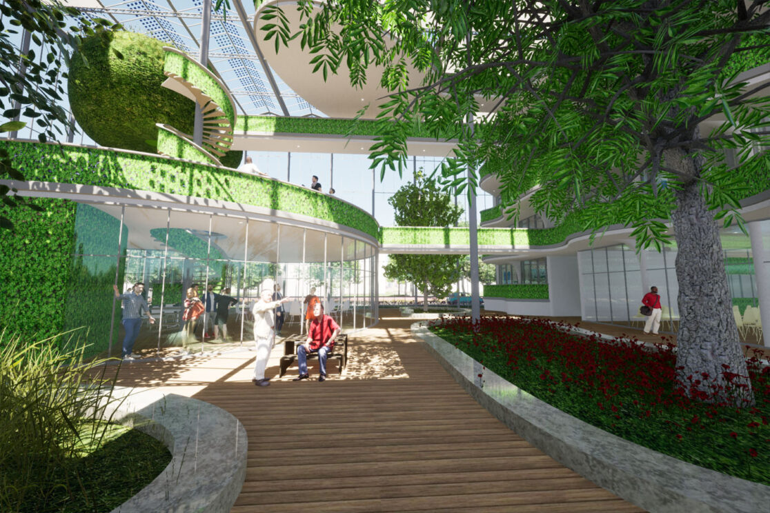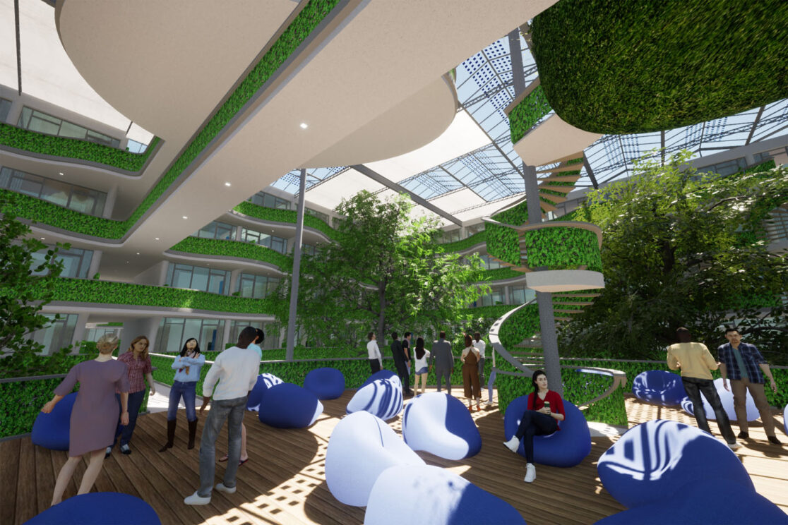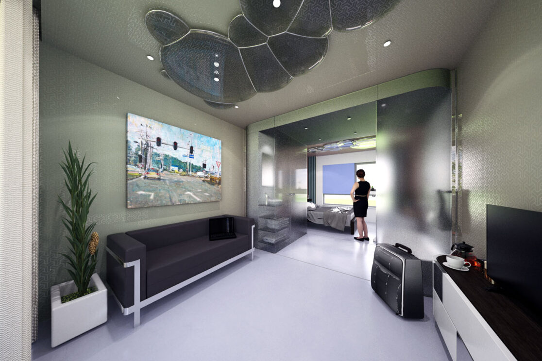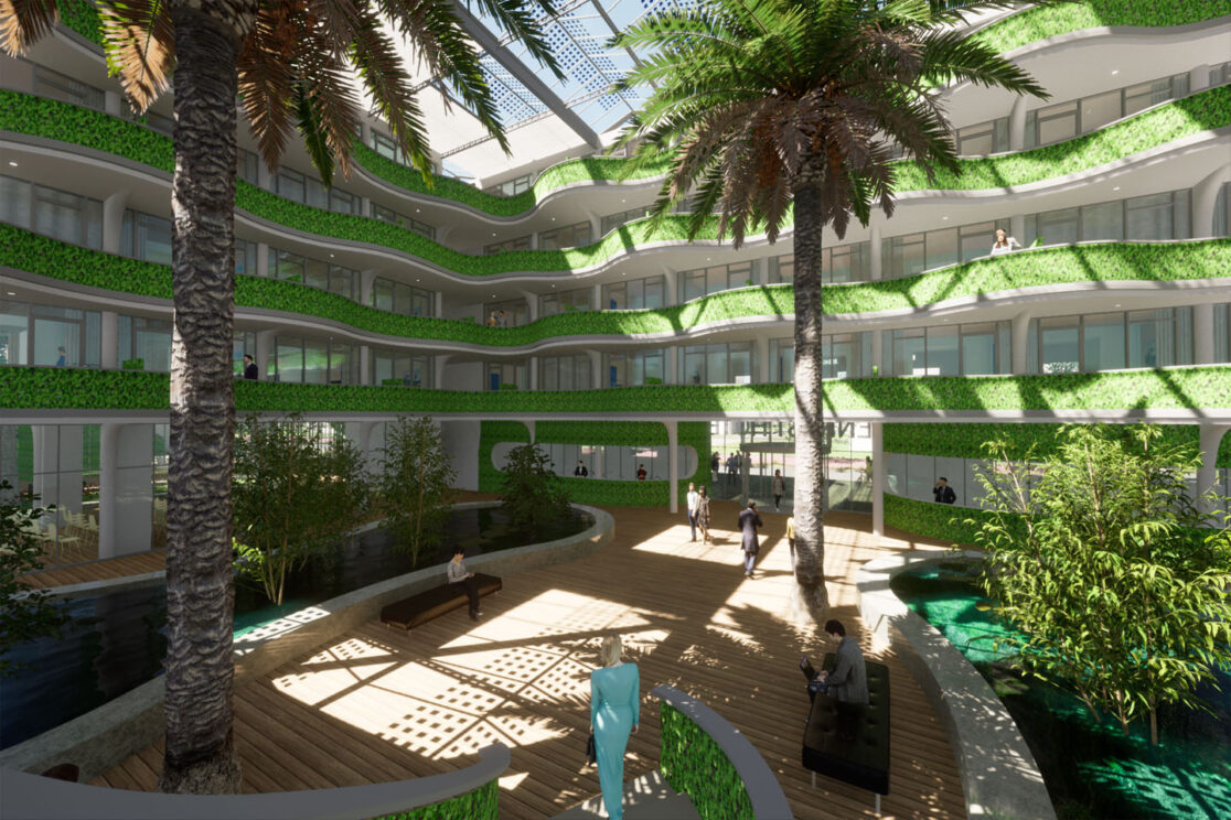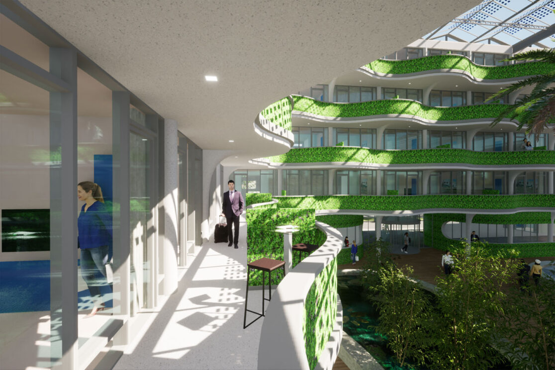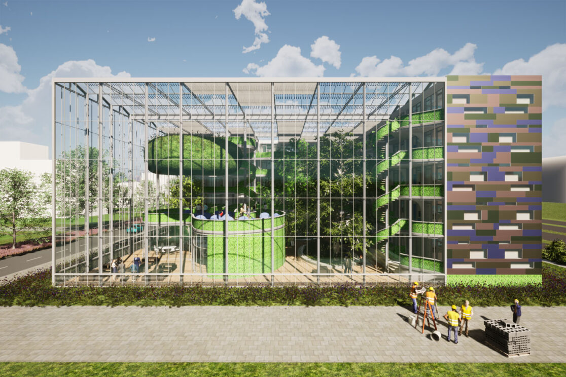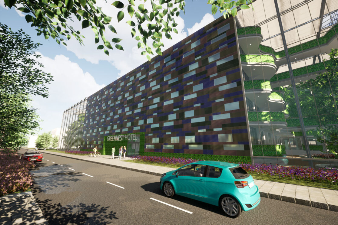 Greennest hotel Floriade is conceived as Hollands first energy & food producing hotel & shortstay for the ambitious Floriade fair. The layout and 1=2 room-concept creates a flexible layout, and 3 large atria guarantied good weather for the whole year. The wooden structure is modulair, which matches the flexible layout and made adaptation, extensions, topping and phasing a breeze.
