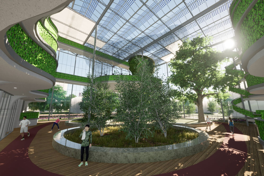 Energy is collected and produced with heat pumps, solar panels and by the intermediate climate of the 3 large atria’s, and stored and recuperated with large water basins underneath the slabs. The hotel would produces more anergy than it needs, and cleans all its waste water in plant based filters. A great variety of plants make up for a clean and healthy indoor environment and a ‘reap your own vegetables’ – pizza menu in the restaurant. 2 luxurious (wedding)suites reside in the middle of the open space of the atria, as a birds nest in a green oasis.