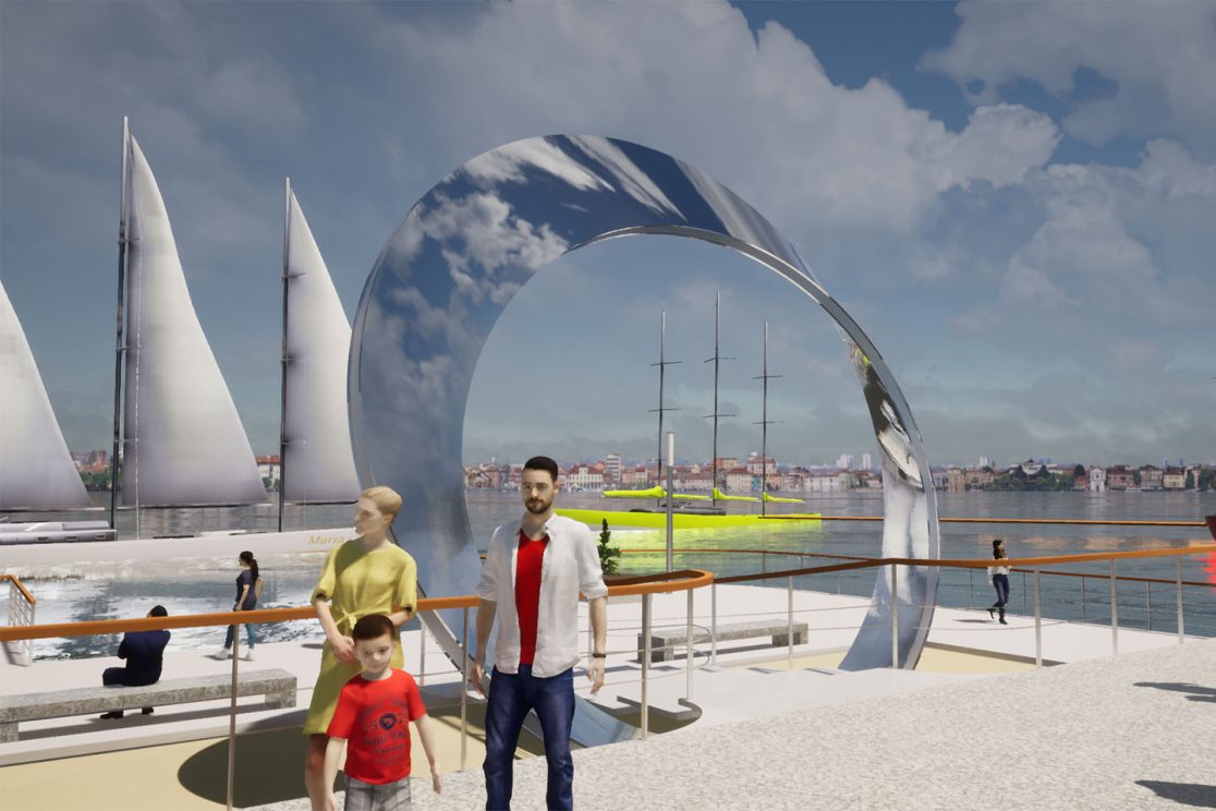 The artwork is a Moebius rim that serves as a point of entry. The surface of the Moebius is polished stainless steel that reflects and distorts the surrounding panorama, bending and creating new perspectives.