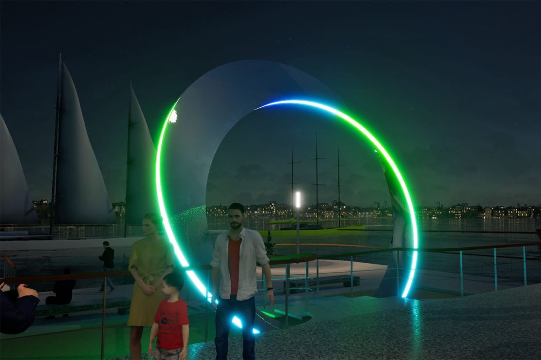 During the night the edges of the Moebius rim illuminate waves of gentle color, shifting attention away from the reflections and creating a new reality that marks the transition of passing the marina gate.