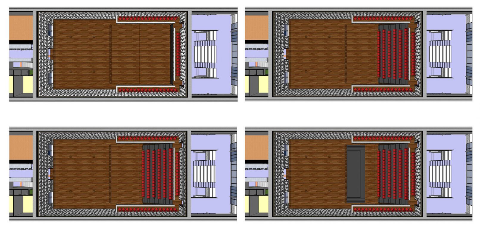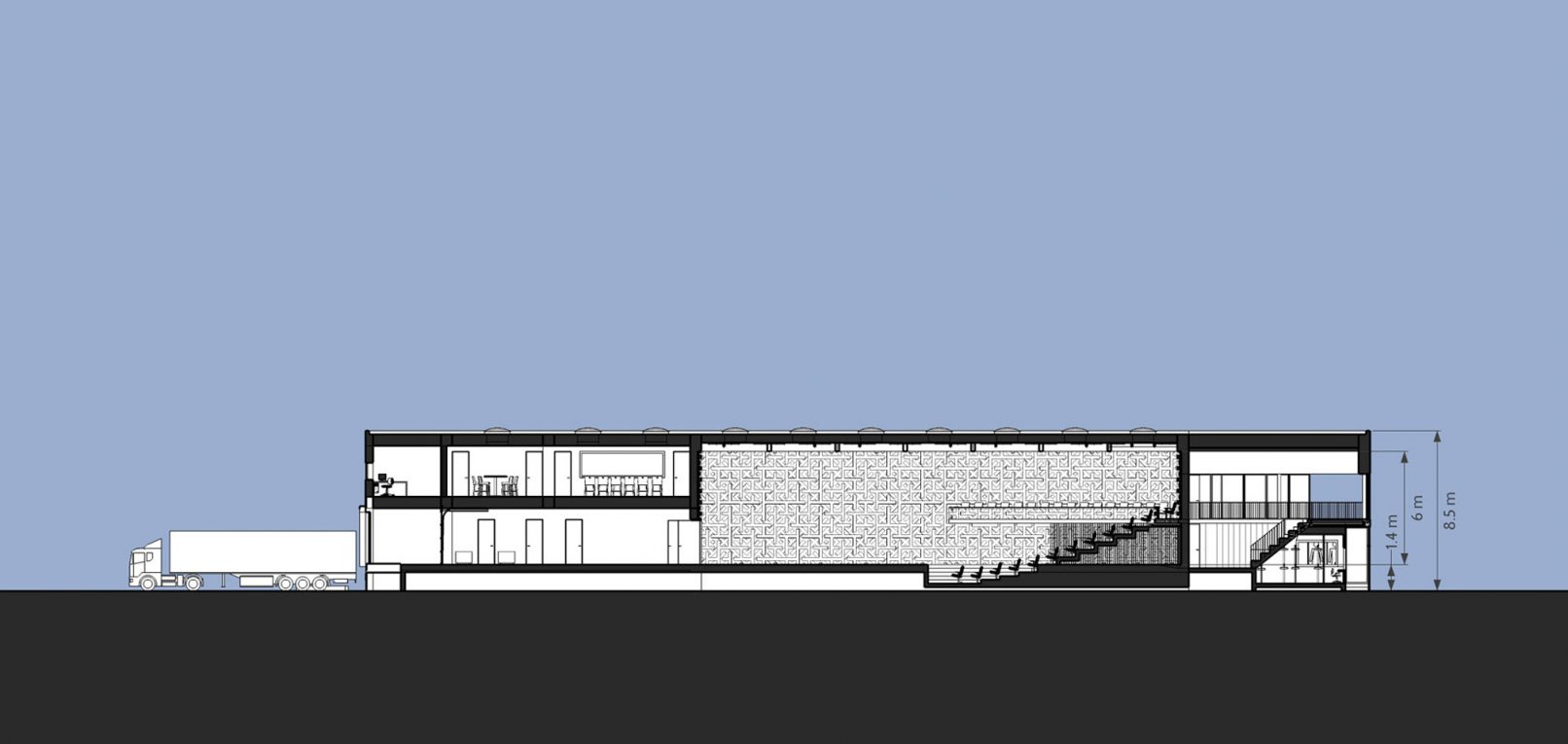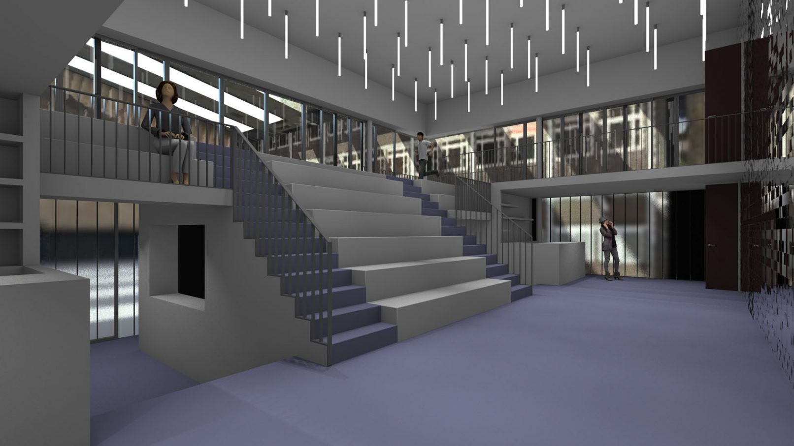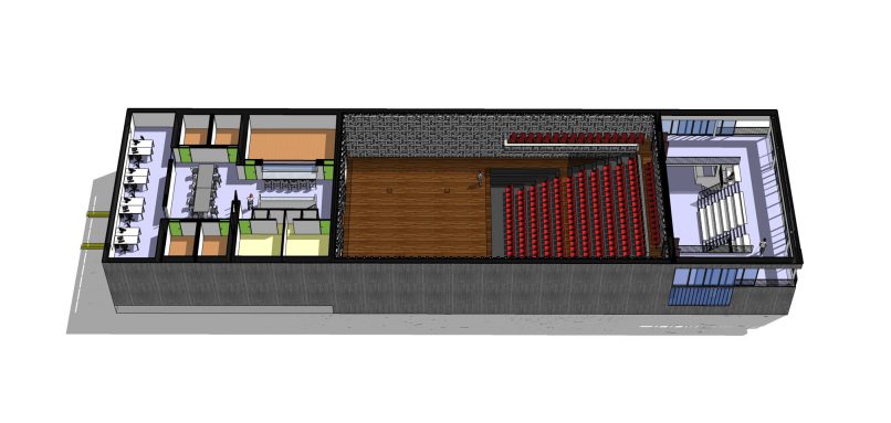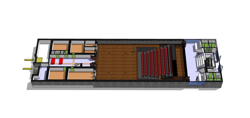 In a yet to be selected existing industrial hall a floating box will be inserted, creating a soundproof box-in-box at minimum cost. The dimensions of the box and main hall are optimized for a full performing Metropole Ochestra, and fit in a typical space for an industrial hall. A flexible layout for the main hall ensures a great variety of use; concert hall, main rehearsal hall, large recording studio with separate drum and vocal booths as well as a theater hall with the possibility to combine music and performance.