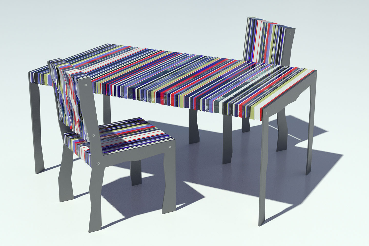 These leftover pieces are layered and compressed within a supporting steel structure, forming a colorful tabletop, with chairs to match.