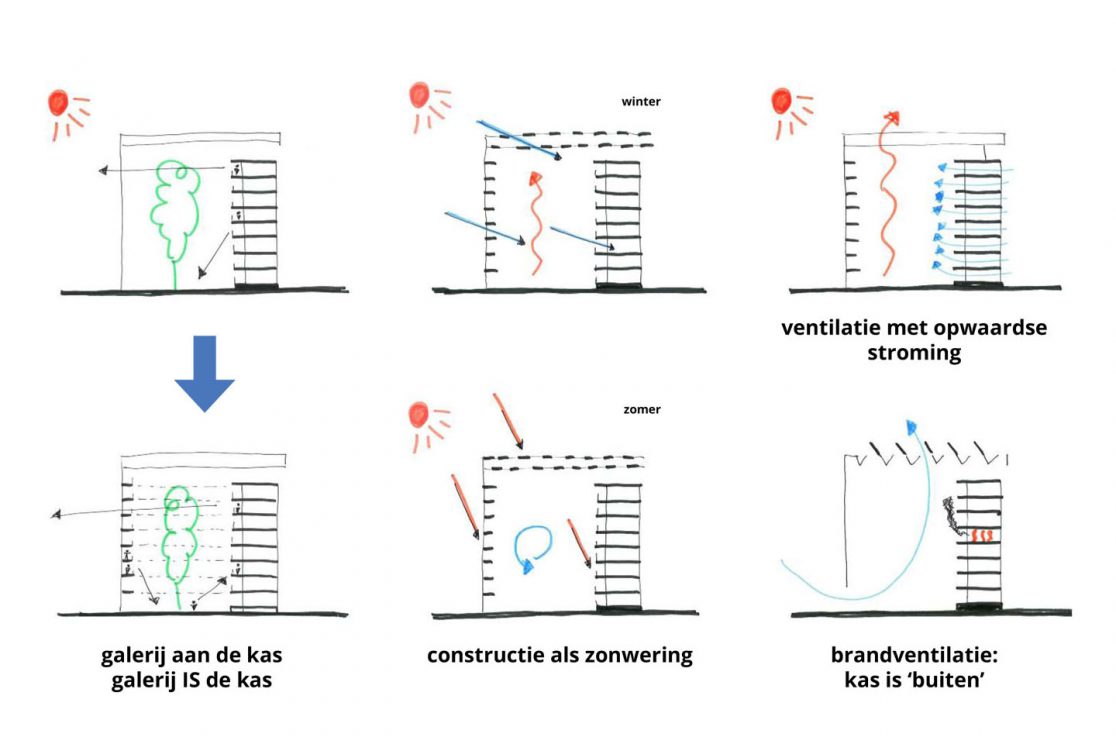 Oase hotel is concept for a family hotel in the Buiksloterham, Amsterdam Noord. Buiksloterham is a former industrial area with little to none public space. The goal of the hotel was to address this omission by introducing a large glass house over the hotel, creating a mild climate and tranquil outdoor space in the otherwise noisy and windy area.